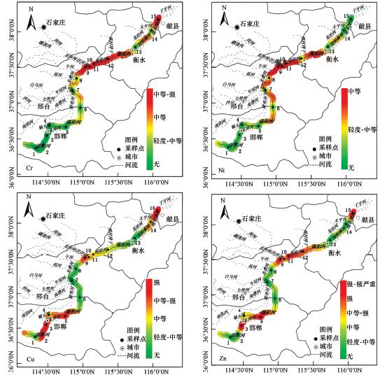 從Igeo指數污染水平分布(圖 4)可以看出,6種重金屬元素均存在不同程度污染.Pb和Cd為滏陽河中重金屬主要污染物,在研究河段有不同程度污染級別,其中Cd在邯鄲段下游和邢臺段洨河匯入點下游達到中等-強污染,在邯鄲段上游、邢臺段汪洋溝和邵村排干匯入點以及滄州段獻縣地區達到強污染,在邢臺段北澧河匯入點達到強極嚴重污染;Pb在邯鄲段上游靠近邯鄲城區和邢臺段北澧河的匯入點達到中等-強污染,在滄州段獻縣地區達到強污染;另外,Cu分別在邯鄲段上游和滄州段獻縣地區達到強污染;Zn在邢臺段邵村排干匯入點達到中等-強污染,在邯鄲段下游靠近邯鄲城區、邢臺段北澧河和汪洋溝匯入點以及滄州段獻縣地區達到強污染,在邯鄲段上游靠近邯鄲城區達到強極嚴重污染程度.