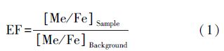 沉積物重金屬富集系數法(Enrichment Factor,EF指數)是某種重金屬元素含量對參比元素標準化比值得到重金屬元素富集程度的一種方法.由于Fe具有在地殼中大量存在且穩定性好、不易遷移等特點,將Fe作為富集系數法參比元素.此外,通過EF對沉積物重金屬來源進行分析,判斷污染源,計算方法如下: