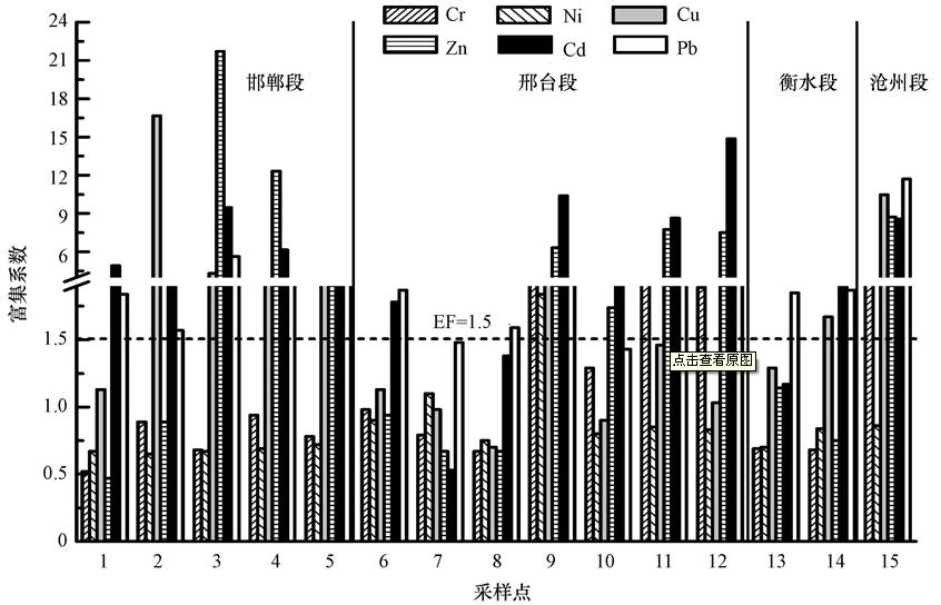 表明Ni和Cr主要來源于地殼和天然地球化學過程.Cu、Zn、Cd、Pb元素平均富集系數分別為3.21、4.93、5.25和2.91,在河段上存在不同程度富集,其中Cu在邯鄲段上游和滄州段獻縣地區富集嚴重,富集系數分別為16.7和10.5,Zn在靠近邯鄲城區(3、4號樣點)富集嚴重,富集系數分別為21.7和12.3,Cd在邯鄲段上游、邢臺段北澧河匯入點和邵村排干匯入點富集嚴重,富集系數分別為9.47、10.4和14.9,Pb在滄州段獻縣地區富集嚴重,富集系數為11.7,表明4種重金屬元素受人為輸入源影響較大.