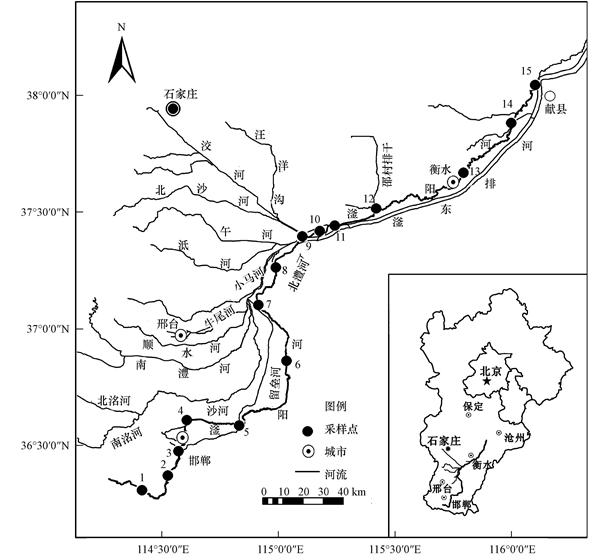 滏陽河屬海河流域南系,地理位置114°E~116° E、36°N~38°N,由14條支流匯流而成(圖 1).滏陽河流經邯鄲、邢臺、衡水,于獻縣臧橋與滹沱河匯流后稱為子牙河.滏陽河屬北溫帶大陸性季風氣候,夏季炎熱多雨,冬季寒冷干燥,年均氣溫13.4 ℃,年均降雨量550 mm,多集中于6—9月.滏陽河流域農業水資源利用量占75%,導致河流水資源補給主要以沿途接納的城市生活污水和工業廢水為主,重金屬污染嚴重.綜合考慮滏陽河干流沿岸土地利用類型、河流形態、支流匯入位置、城市上下游等因素,在滏陽河上、中、下游設置采樣點15個,分別是邯鄲段(1~3號樣點位于邯鄲段上游,4、5號樣點位于邯鄲段下游)、邢臺段(6~8號樣點位于邢臺段中游,9號樣點位于北澧河匯入點,10號樣點位于洨河匯入點下游,11號樣點為汪洋溝匯入點,12號樣點為邵村排干匯入點)、衡水段(13、14號樣點)和滄州段(15號樣點,獻縣東賈莊橋村西).具體采樣區域和采樣點分布如圖 1所示.