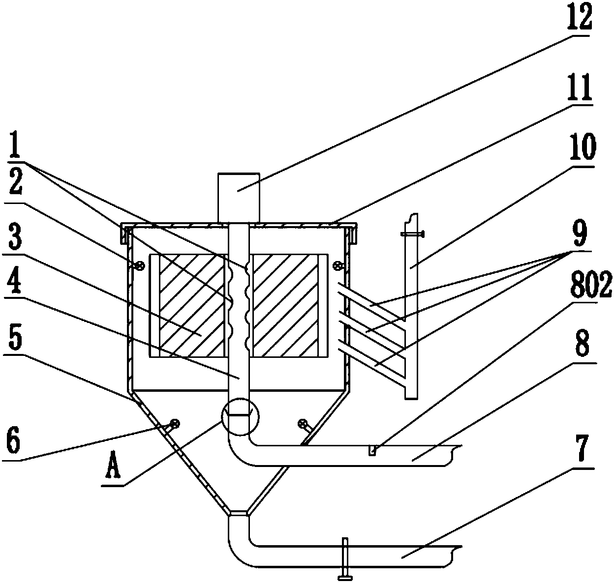 在已處理水排出管道末端的內壁表面安裝有用于檢測已處理水流量的壓力傳感器;所述空心軸的上端穿過殼體并由置于殼體頂端的電機驅動其轉動,圓筒形過濾器固設在空心軸外端并隨其轉動;所述圓筒形過濾器沿其徑向均勻布置有多個三角形凹槽;所述豎直段與空心軸同軸設置,豎直段的上端的外邊緣設有一錐筒狀擋水罩;所述噴嘴的設置方向與圓筒形過濾器的軸線方向之間的傾斜角度為60-90゜,噴嘴口呈喇叭狀;