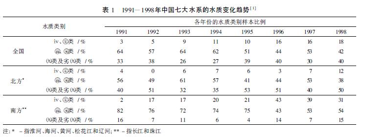 用水逐年增長(zhǎng), 水資源浪費(fèi)嚴(yán)重。據(jù)統(tǒng)計(jì), 自1949) 2002年, 全國(guó)用水量增加了4 000多億m3,大約每10 年增加1 000 億m3, 年平均增加約為100億m3。1980年以后, 全國(guó)總用水量的增長(zhǎng)幅度略有下降, 但年平均增長(zhǎng)量仍為62億m3 左右。農(nóng)田灌溉多沿用傳統(tǒng)方式, 灌溉利用系數(shù)在0. 45左右, 至少有一半的水被浪費(fèi)。工業(yè)用水利用率也很低, 發(fā)達(dá)國(guó)家的萬(wàn)元GDP 用水量一般在50 m3,而中國(guó)的萬(wàn)元GDP用水量卻在730 m3。水質(zhì)不容樂(lè)觀, 2006年, 中國(guó)廢水排放總量達(dá)到536. 8億,t 其中工業(yè)廢水為240. 2億,t 占排放總量的44. 7% 。廢水排放居于前四位的行業(yè)依次為造紙、化工、電力和紡織, 這四個(gè)行業(yè)排放的廢水占重點(diǎn)統(tǒng)計(jì)企業(yè)廢水排放量的53. 9%。表1列出了1991) 1998年中國(guó)七大水系的水質(zhì)變化趨勢(shì)。