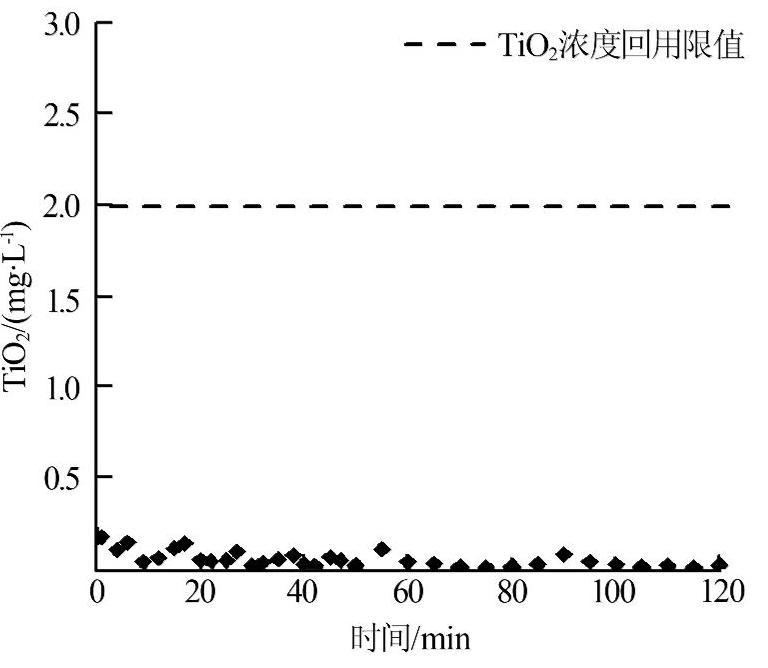 由圖2可見,微濾過程中滲透液中二氧化鈦質量濃度不超過0.176 mg/L,遠低于2 mg/L的回用要求。