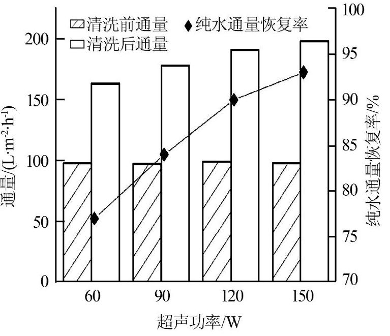 試驗中,將受污染的膜置于超聲清洗機中,超聲清洗機比較大功率為150 W。清洗后的膜用清水進行無壓漂洗,比較后將膜組件接入管路,進行純水通量試驗,并以清洗后的純水通量與新膜純水通量之比作為純水通量恢復率來表征清洗效果。