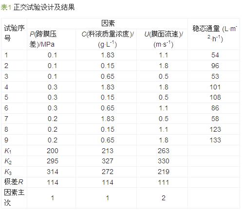 以跨膜壓差(P)、料液濃度(C)及膜面流速(U)為試驗因素進行正交試驗,每個因素各取3個水平,測定相應情況下的穩態通量,并利用Excel軟件進行正交分析,結果見表1。