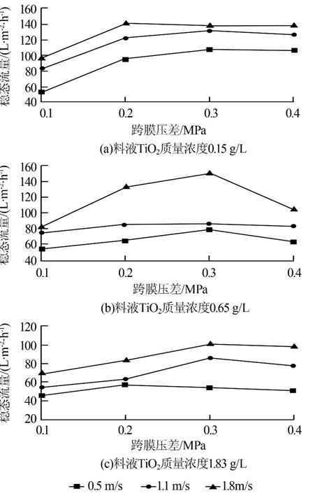 試驗過程中,在出水滿足要求的情況下,考察不同操作條件對穩態膜通量的影響。在料液二氧化鈦質量濃度為0.15、0.65、1.83 g/L 3種情況下,分別選取跨膜壓差為0.1、0.2、0.3、0.4 MPa,膜面流速為0.5、1.1、1.8 m/s多種工況,測定其穩態通量。各主要工藝參數對穩態通量的影響如圖4所示。