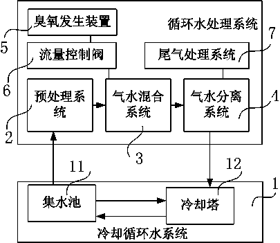 基于臭氧發生器的冷卻循環水處理系統,包括冷卻循環水系統,所述冷卻循環水系統上并聯有循環水處理系統;所述循環水處理系統包括順次連接的預處理系統、氣水混合系統、氣水分離系統,連接在氣水混合系統上的臭氧發生裝置,以及設置在氣水分離系統上的尾氣處理系統;
