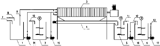 7.如權利要求1所述的一種水處理吸附劑再生系統,其特征在于所述的液堿罐(1)和板框壓濾機(3)的進料端之間的管路上設有液堿泵(14),所述的濃縮池(2)和板框壓濾機(3)的進料端之間的管路上設有污泥泵(15),所述的粉碎攪拌機(5)和加藥池(6)之間的管路上設有第二污泥泵(16),所述的吸附劑加藥管(13)上設有加藥泵(17)。