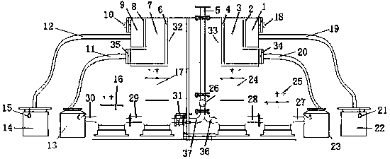 所述一種新型污水凈化一體提升泵,在污水箱32上設有進水管10,在進水管10的污水箱32上設有隔渣板8,所述隔渣板8在污水箱33內分出隔渣室9,在隔渣室9下端設有排渣管12,在排渣管12下端設有排渣桶14,在排渣桶14上端設有排渣信號15,所述在隔渣室9外的污水箱32上設有隔污板6,隔污板6在污水箱32內形成隔污室7,在隔污室7下端設有過濾網35,在過濾網35上設有排污管11,在排污管11下端設有排污桶13,排污桶13上設有連通管30,在連通管30后端設有凈化泵16,凈化泵16上設有連管29,在連管29后端設有提水泵17,在提水泵17上設有啟閉閥31,在啟閉閥31上設有彎管37,在彎管37上端設通管閥26,在通管閥26上端出水管5。