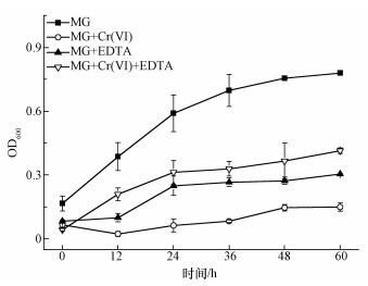 如圖 1所示,在空白實驗中(沒有重金屬Cr(Ⅵ)或者EDTA存在的條件下),即僅加入0.1 mmol·L-1的孔雀綠(MG)時,B. Cepacia C09G在前36 h快速生長,OD600接近了0.7,而后因為MG基本降解完,缺乏營養物質生物量增長緩慢,60 h后比較終OD600值為0.78;僅加入0.5 mmol·L-1 Cr(Ⅵ),對微生物的生長有很強的抑制作用,生物量很低,僅為0.15;僅加入0.5 mmol·L-1 EDTA,毒性雖然比Cr(Ⅵ)更小,但仍有一定的抑制作用,60 h時OD600為0.31.據報道,EDTA和EDTA-Metal對土壤微生物都是有毒的(Grcman et al., 2001).當同時添了EDTA和Cr(Ⅵ)時,OD600為0.42,大于單獨加入Cr(Ⅵ)或者EDTA時,說明其生物毒性比單獨加入Cr(Ⅵ)或EDTA有所降低,因此,可以推測EDTA可以有效降低Cr(Ⅵ)的毒性.