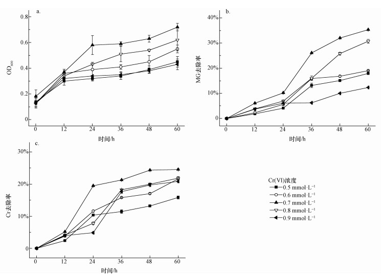 將已算好體積的藥品加入降解培養基中,每支玻璃離心管(無菌)中加入15.0 mL的降解培養液,再加入菌液(初始OD600=0.7,體積比6%),塞上棉花塞,放入搖床(150 r·min-1,30 ℃)培養0、12、24、36、48、60 h后分別測定OD600、MG和Cr(Ⅵ)濃度.上述每個試驗均做3個平行,結果取其平均值,并計算標準偏差.