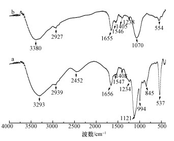 圖 7為菌株B. Cepacia C09G吸附孔雀綠及孔雀綠和Cr(Ⅵ)后的FTIR光譜圖.由圖 7可知,2939~2927 cm-1處的峰是—CH、—CH2及—CH3的不對稱振動峰,在1655 cm-1和1546 cm-1處出現由氨基酸I的—NH2與氨基酸II的—COOH形成的—NH/CO的伸縮振動吸收峰,1408~1405 cm-1處分別為孔雀綠及降解產物芳環上的C=C的伸縮振動峰和O—H的彎曲振動峰.圖 7b相比于圖 7a,在2452 cm-1和845 cm-1處的峰消失,1070 cm-1處峰的產生是由于氨基酸的—NH轉變為C=N共軛鍵.這說明菌株C09G的去除過程主要是—OH、—COOH、—NH2、—NH/CO等官能團與Cr相互作用(Nandi et al., 2009).