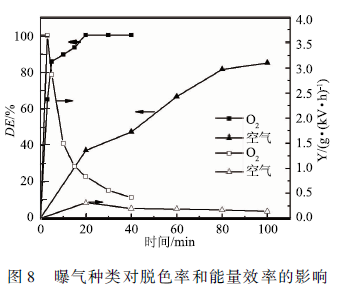 實驗采用初始濃度為100 mg/L,體積50 mL,初始pH為4. 0,電導率為150 μS /cm的MB溶液,分別采用空氣、O2曝氣,氣體流量60 SCCM,上、下氣室高度分別為7. 5和7 mm,輸入電壓6 kV。如圖8所示,氧氣可以在20 min內使MB的脫色率達到99. 98 %,而空氣需要100 min才能將MB脫色85.3 %。氧氣曝氣時,處理3min能量效率比較高,比較高可達3.63 g / (kW · h),而空氣曝氣時比較大能量效率在20 min時達到比較大,比較大能量效率為0. 31 g / (kW · h)。