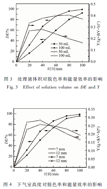 一方面,電極間距加大,放電空間內的電場強度下降,在輸入電壓相同的條件下,下氣室高度從7 mm增加到12 mm,輸入功率從18 W下降到15 W。輸入電能減少,使放電空間中活性物質減少,導致脫色率和能量效率下降。