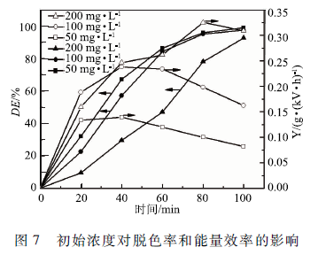 實驗采用50 mL初始pH為4. 0,初始濃度分別為50,100和200 mg/L ,電導率分別為84,150和200 μS /cm的MB溶液,空氣流量60 SCCM,上、下氣室高度分別為7. 5和7 mm,輸入電壓6 kV。如圖7所示,MB的脫色率隨初始濃度的增加而下降,而能量效率隨初始濃度的增加而升高。