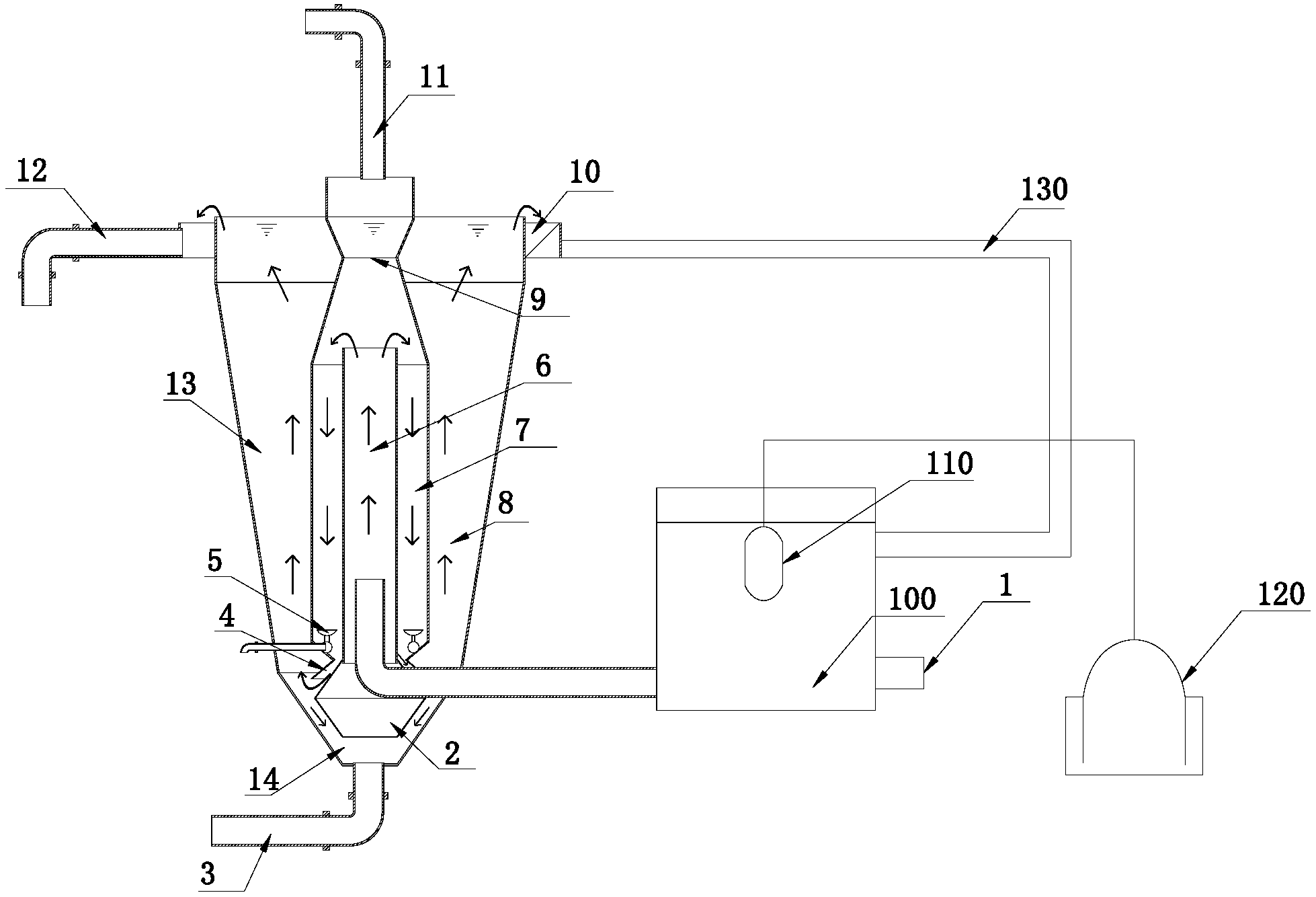 技術人員介紹,該方法依賴一套污水處理系統,污水處理系統包括集水池、集水池的一側設有進水管,集水池的另一側通過管道與一豎式污水處理裝置的底部相連;集水池中設有超聲波探頭,所述超聲波探頭通過連接件與超聲波發生器連接;所述豎式污水處理裝置包括:厭氧區、好氧區以及沉淀區;所述的三個區為三個套筒相互嵌套組合結構。